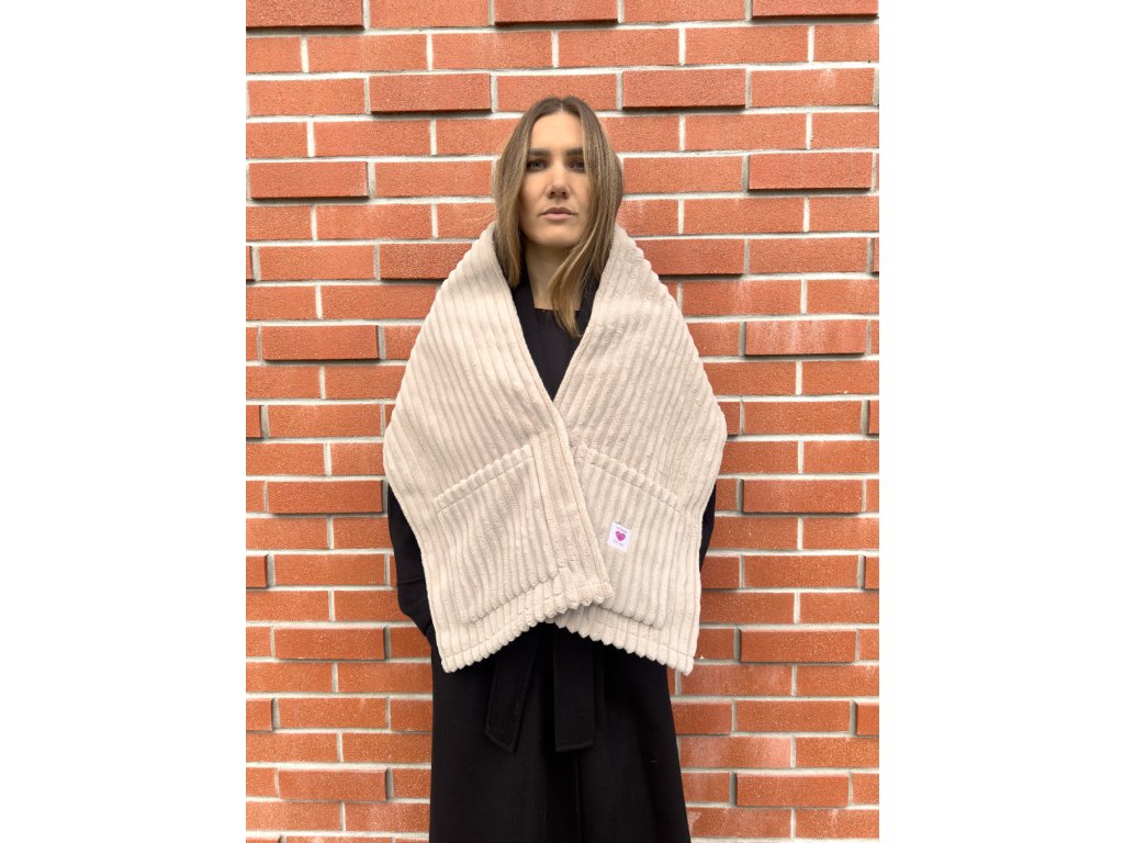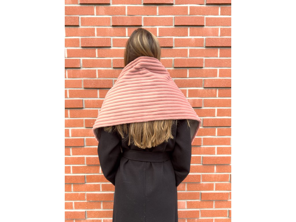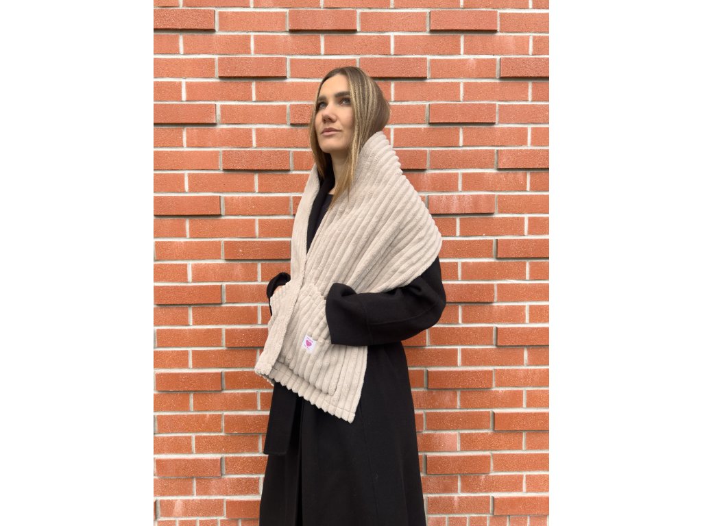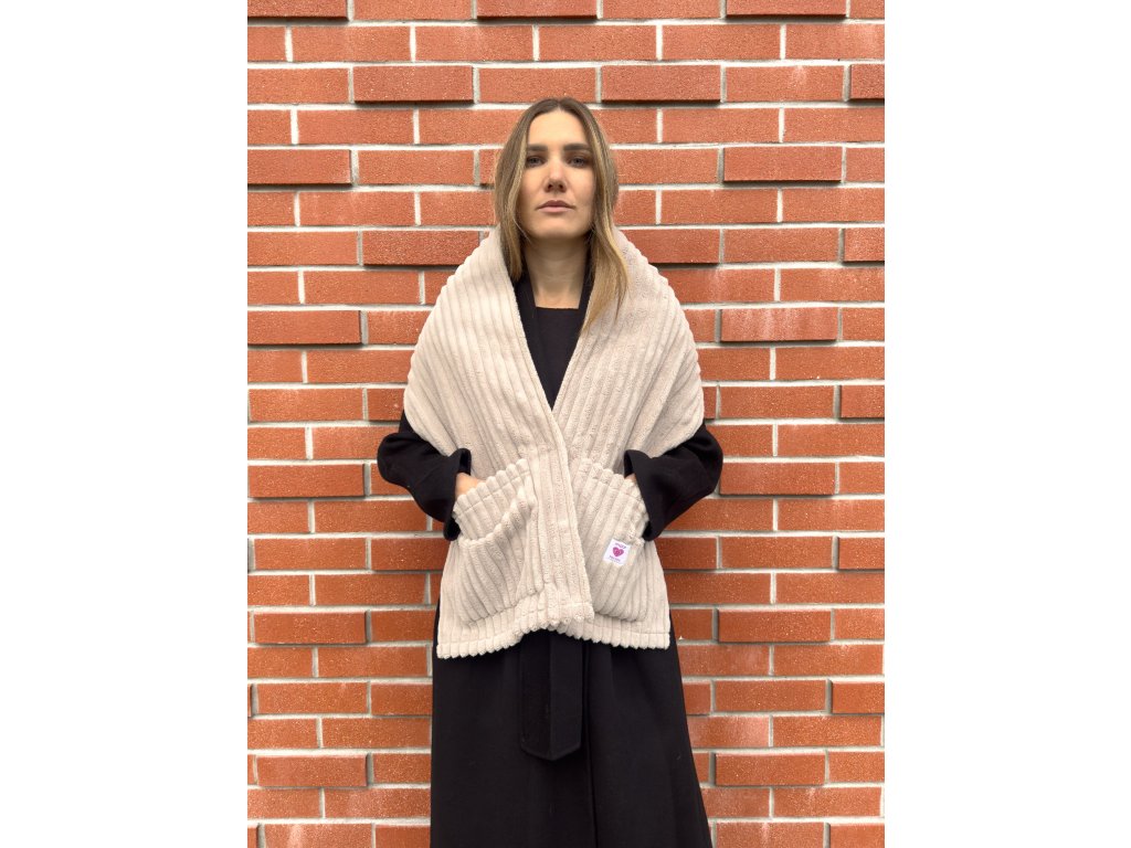 Plyšový menčestrový šál, ktorý si jednoducho prehodíš cez seba a zapneš dvomi praktickými patentkami. Mäkký plyšový materiál vytvára pri šití jemné, hravé oblúčiky, ktoré dodávajú šálu šmrnc a textúru. Teplý, štýlový a ideálny na chladnejšie dni – kombinácia pohodlia a elegantného vzhľadu v jednom doplnku.