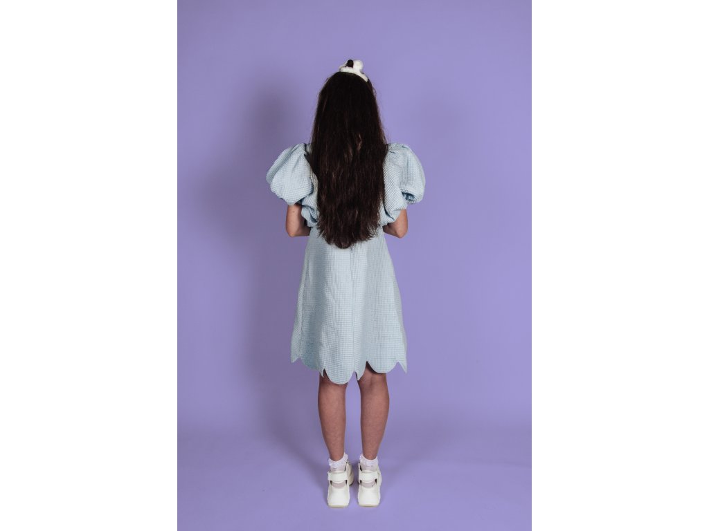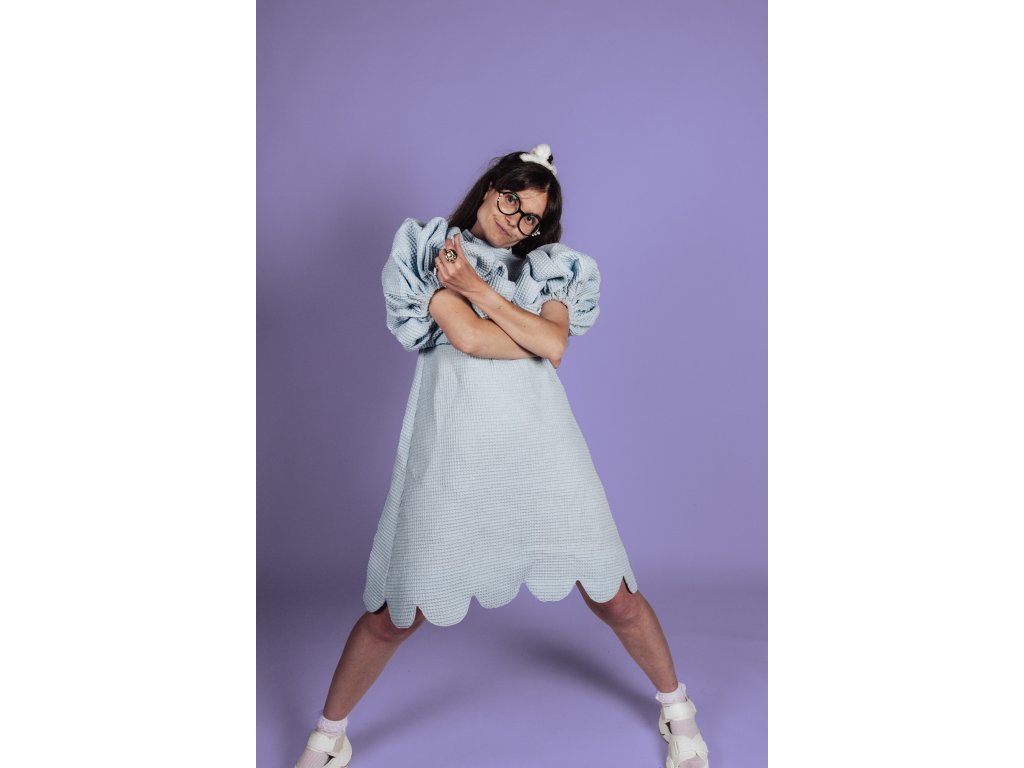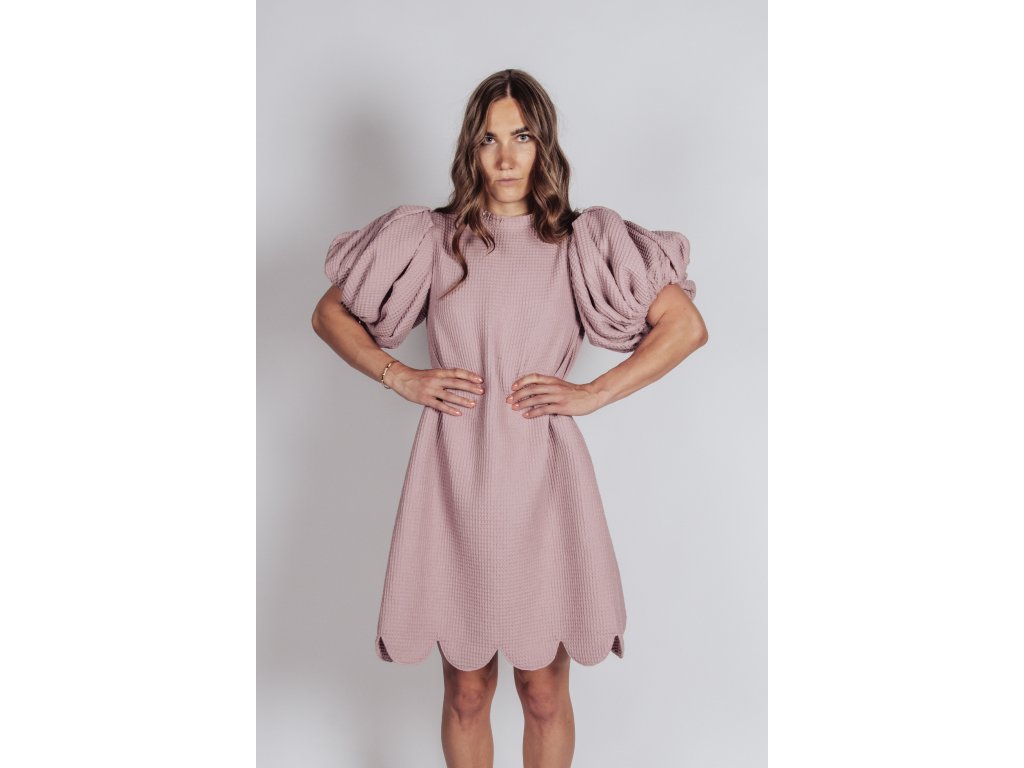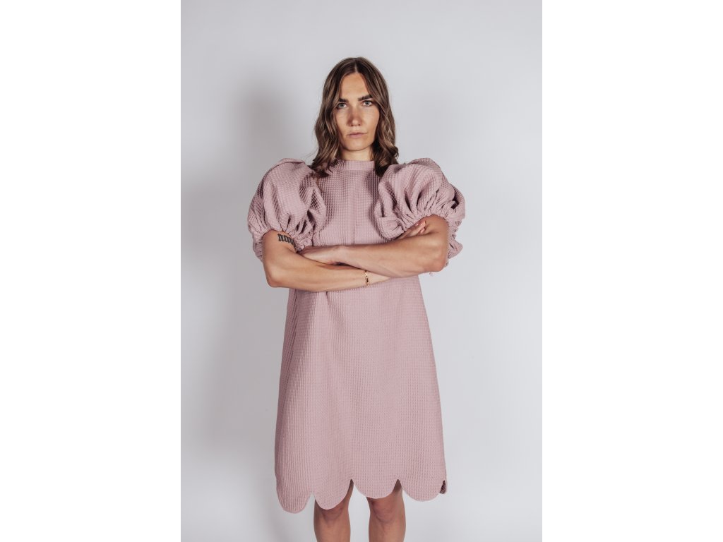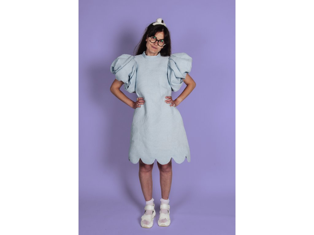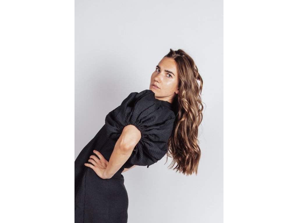 STRIH: BALÓNOVÉ RUKÁVY PRE OBJEM A JEMNÚ SILUETU, VLNKOVANÝ SPODNÝ LEM DODÁVA HRAVOSŤ A POHYB.